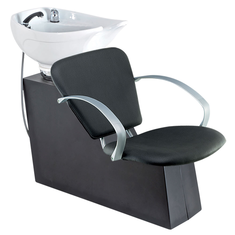 Kompakti pesupaikka, joka on varusteltu Kelly-tuolilla sekä valkoisella kallistuvalla altaalla.